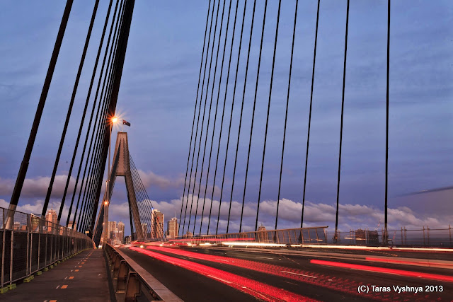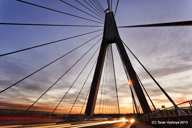 И эти же ванты образуют частокол, оттененный размазанными огнями машин. Это если на закате смотреть на юго-восток, в сторону Сити.