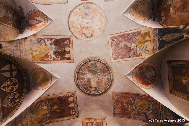 В качестве бонуса - в замке чудесные фрески. Вот, например, потолок главной галереи у входа в замок.