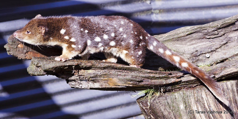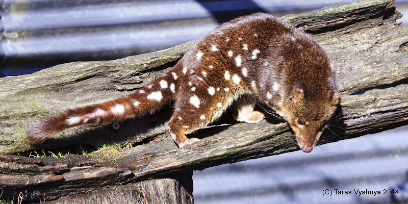 И опять Куолл. Это видимо пятнистохвостый экземпляр. Как видно по его пятнистому хвосту. (Spotted-tail Quoll). А есть еще восточный Куолл, с, очевидно, востоком по всей задневыступающей части тела. Eastern Quoll. Кстати обратите внимание на левую часть коряги, на которой стоит это зверинище. Слева от его морды. Силуэт ничего не напоминает?