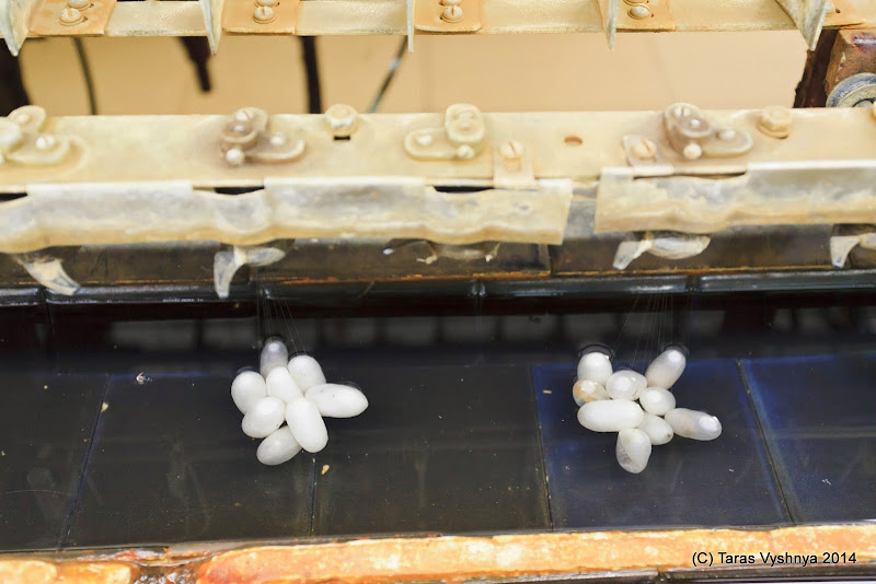 Но до этого стройными рядами они радостно плещутся в воде, разматывая свой кокон в тонкую шелковую нить, наматываемую на катушки. Здесь к сожалению о наличии нитей можно только догадываться, настолько они тонкие против фото-оптики.