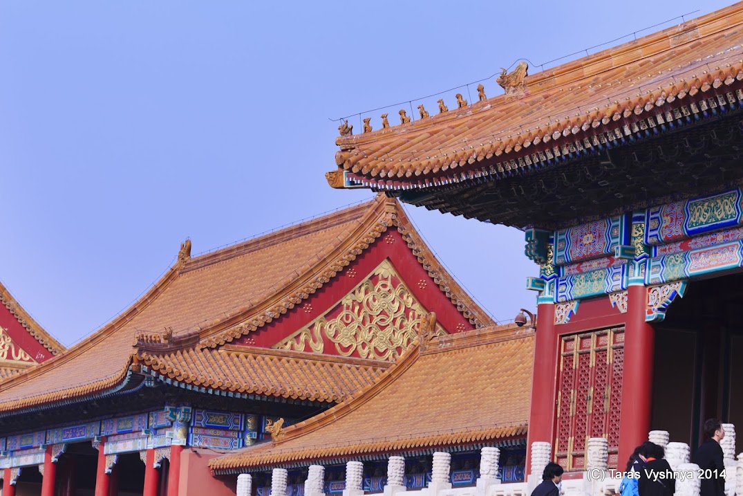 В первую очередь такими интересными деталями для нас являются характерные китайские крыши. Довольно сложной формы, с неровными, вогнутыми ребрами, загнутыми к верху у краев, традиционными фигурками у самого окончания... В запретном городе сюда же добавляется большая концентрация этих самых крыш на единицу площади, и зачастую они переплетаются самым причудливым образом...