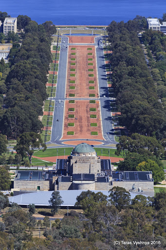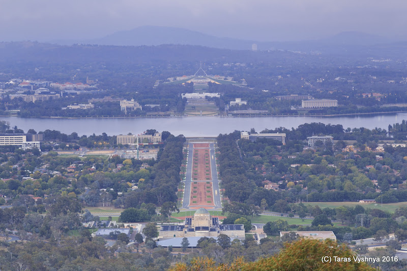 В заключение темы Канберры - всеохватывающие виды центра города с самой высокой окрестной горы - Mt Ainslie. Именно она находится на одной линии с обоими парламентами, мемориалом-музеем Анзак и одноименным бульваром.