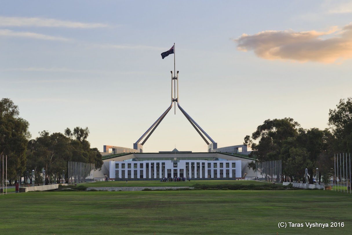 И дальше опять всевозможные ракурсы узнаваемого здания австралийского парламента на закате с живописным отражением в воде пруда-бассейна-фонтана.