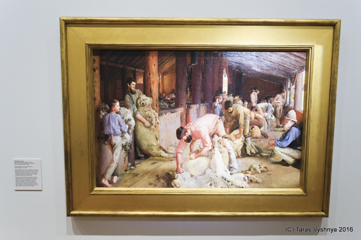 И вконце несколько слов о самом славном австралийском художнике - Томе Робертсе. Его выставка как раз проходила в НАциональной Галерее Австралии. Экспозиция его работ была максимально всеобъемлющей, понастаскивали его полотна со всех музеев и галерей Австралии. Даже пару скульптурок привнесли.