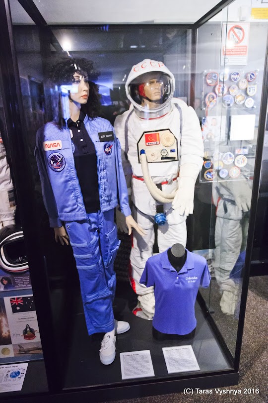 Еще забавный момент. Скафандр советского космонавта из совместной миссии СОЮЗ - АПОЛЛОН. Неизвестные дизайнеры оформители экспоната понятия не имели как выглядит серп и молот, и какие буквы нужно написать на фоне красного флага. Поэтому надпись идентифицировать не удалось.